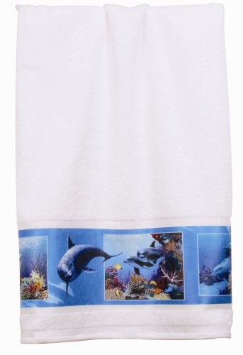 - Solid white base accented by print with dolphins cavorting about coral reefs with turtles and brilliantly hued fish